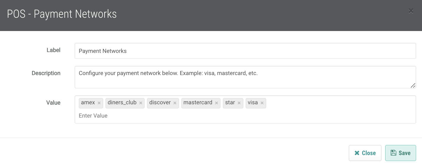 Payment Networks Payment Networks help you configure network types for sending specific payment information for a POS transaction. To configure your payment network: