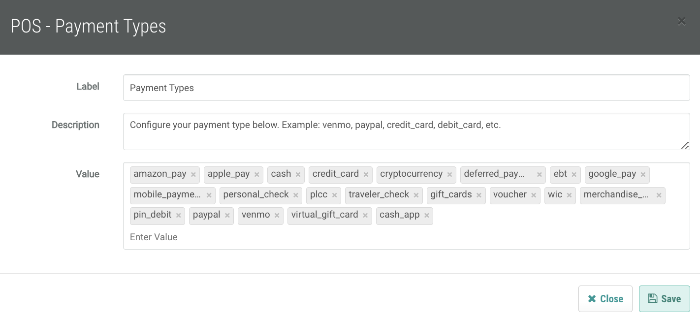 Payment Types Payment Types help you configure payment types for sending specific payment information for a POS transaction. To configure your payment type: