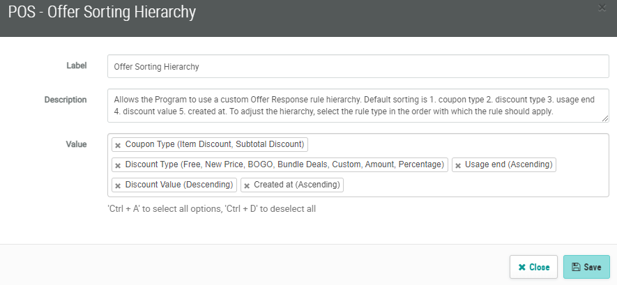 Offer Sorting Hierarchy By default, when offers are fetched by the POS APIs, the offer responses are sorted in a standard hierarchy: 1. Coupon Type, 2. Discount Type, 3. Usage End, 4. Discount Value, and 5. Created at.