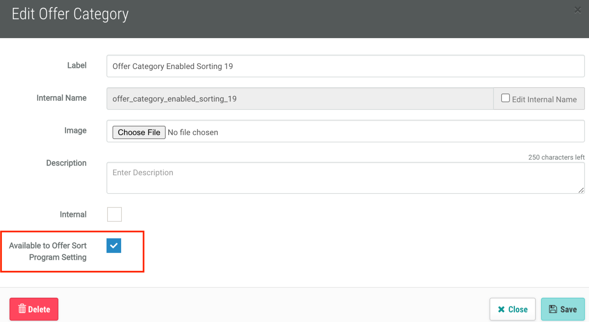 Enable Sorting Attribute In order to enable the Offer Categories option, you must first enable the sorting attribute in the Edit Offer Category pop-up: