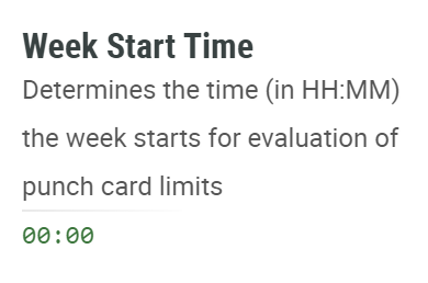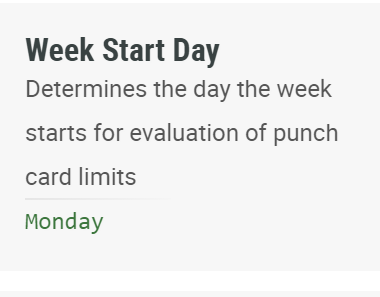 Note: This setting allows you to configure weekly limits for both Standard Punch Cards and External Punch Cards. Week Start Day Program Setting Indicates the day of the week the weekly limit period begins. This value defaults to Monday but can be configured per the business requirements. To set the Week Start Day: