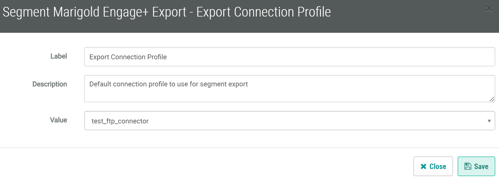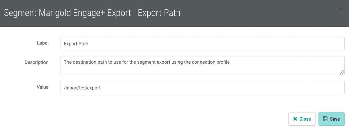 Export Path: The value of the path where the segment file will be dropped is set in the value field. If not specified, the file will be uploaded to the root directory of the connection profile.