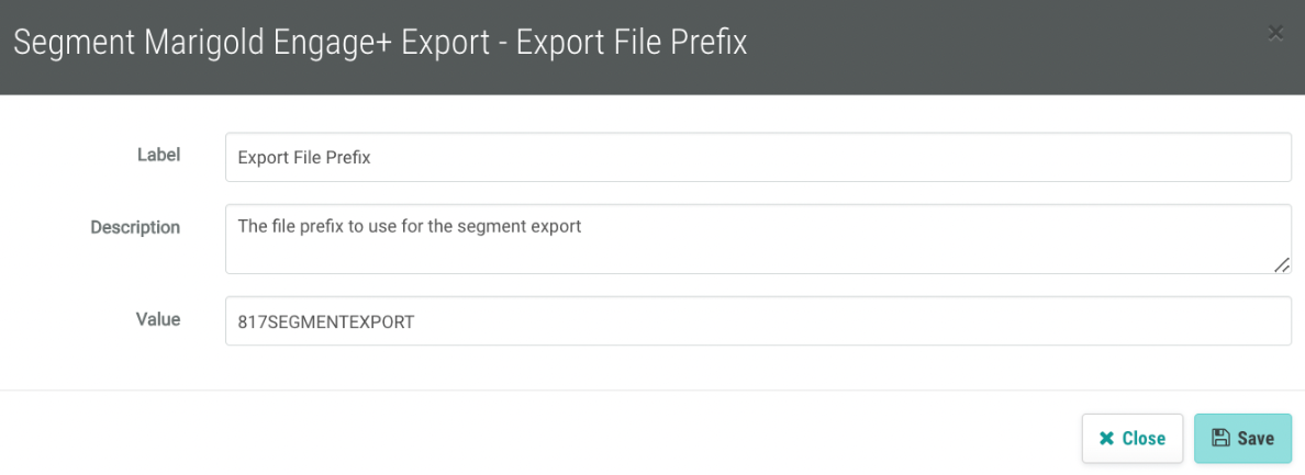 The Segment Marigold Engage+ Export program setting is designed to configure the export destination of segments from Marigold Loyalty to Marigold Engage+. This setting is configured after the connection profile has been created. The three components of the setting are Export Connection Profile, Export Path, and Export File Prefix. Export Connection Profile: The value set for the connection profile, the S3 or FTP profile created for exporting the file to Engage+. The value comes from the Connector. For more on how to set the Connector, please refer here.
