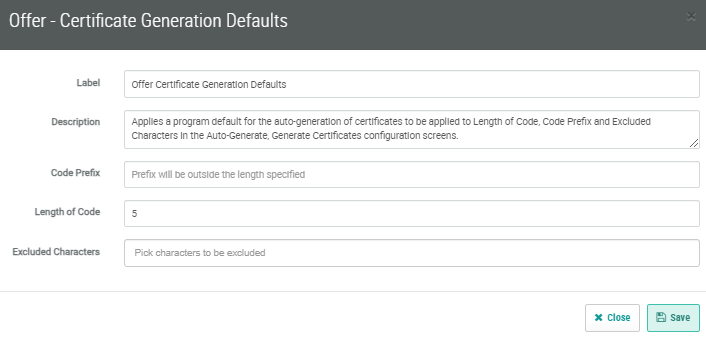 The Certificate Generation Defaults program setting enables users to configure a setting that controls a default used for the Code Prefix, Length of Code, and Excluded Characters fields. This reduces time in configuring offers and/or generation of certificates.